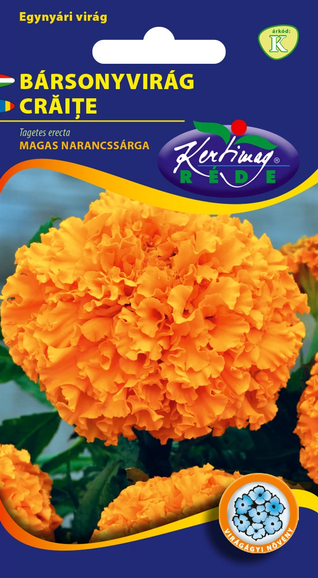 Bársonyvirág - Óriásvirágú Narancssárga - MAGAS - Rédei Kertimag 1g. Óriásvirágú Bársonyvirág (Tagetes erecta). Az alapfaj Mexikóból származik. 80-90 cm magasra nő, nagyméretű virágai teltek. Nem csupán a mutatós, élénk színű virágok miatt kedvelt egynyári virágzó. A levélen, virágon lévő mirigyszőrök kellemetlen illatanyagot árasztanak, ezért sok kártevő elkerüli a növényt. Emiatt a veteményesek, virágágyások kedvelt szegélynövénye. Közepes vízigényű, fény- és melegigényes növény, közepesen tápdús talajban is jól fejlődik, a tűző napot is jól bírja.