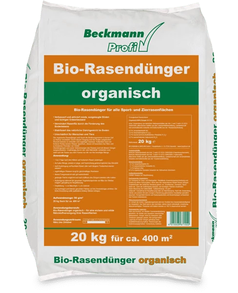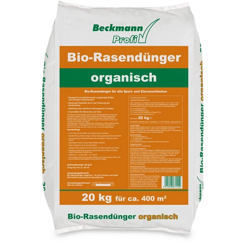 Beckmann Szerves BIO gyeptrágya 20kg 400m2 területre. A gyep biztonságos és kíméletes tápanyagellátásához javasoljuk. Javítja és aktivizálja a kimerült talajokat, pázsitokat. Csökkenti a gyepek filcesedését a talajélet javításával. Kialakítja és stabilizálja a talaj természetes egyensúlyát. Emberekre és állatokra egyaránt ártalmatlan. NPK 9+3+6 + 60 % szerves anyag tartalom. Javasolt felhasználási mennyiség: kb. 50g/m2. Alkalmazási időszak: márciustól októberig.