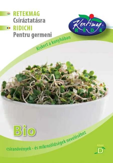 Bio-Retek ehető csíramag A retekcsíra kiemelkedően magas foszfortartalmú. Természetes antiszeptikus hatásánál fogva a nátha és a megfázás ellen jól alkalmazható. Oldja a torok nyálkalerakódásait. Vízhajtó hatása is ismert, segít kisebb vese és epeköveket eltávolítani. Jellegzetes, enyhén csípős íze miatt kiváló vaj- és túrókrémek, saláták ízesítésére, de magában is fogyaszthatjuk. A csíranövények 4 nap elteltével már szüretelhetők. Ellenőrzött ökológiai gazdaságból származó mag!