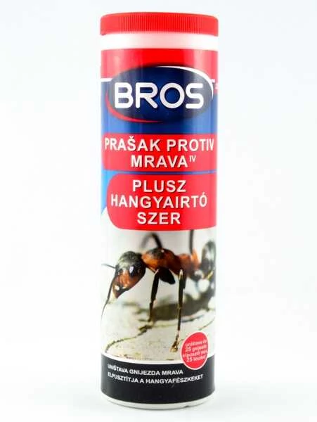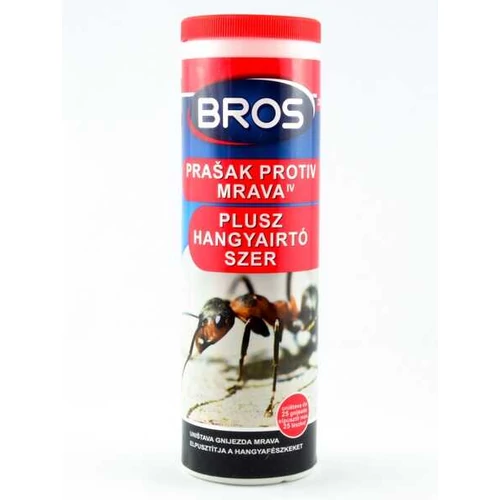 BROS Hangyairtó por 250g könnyen válhat teraszok, autófelhajtók, utakk, nyaralók megmentőjévé. Biocid, vagyis nem természetes anyagokból készült csalétek, ami gyors és látványos hatást ér el. Két fajta felhasználási módja is van. Porként 10g közeli mennyiséget érdemes a fészekre vagy a rovarok vonulási útjába kiszórni, így behordják a szert, ezzel belülről elpusztítva a fészket. Vizesoldat elkészítésekor 100g port 2,5l vzíben alaposan el kell keverni, majd ráönteni a bolyra (~0,5l/boly) így elpusztítva azt. Hatóanyag: permetrin 0,5%, geraniol 0,001%