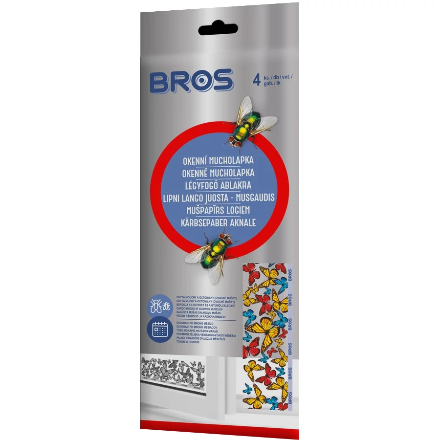 BROS légyfogó matrica 4db-os A csomag 4db mutatós, 21x7cm nagyságú, lepke mintás matricát tartalmaz, ami a rajta lévő, nem száradó anyagnak hála hónapokon át használható. Egyszerű, gyors, pénztárcabarát megoldás. A légyfogó matricát bármilyen ablakfelületre lehet használni, függetlenül a helyiség típusától vagy elhelyezkedésétől. Hasznos legyek, muslicákk és más repülő rovarok ellen is. Használat: Kezdésnek távolítsd el a matricán látható vékony fehér csíkot, majd annak nyomán ragaszd rá az ablakra, vagy más felületre. Ezután távolítsds el az öntapadó szalagot!
