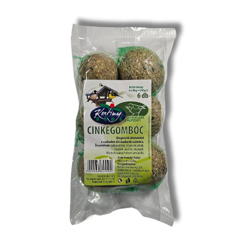Praktikus, 6db-os kiszerelés. Felakasztható faágra, vagy cinkegolyó tartóba is rakható. Cinkék és más madarak számára összeállított, természetes anyagokból készült magkeverék préselt formában, ami biztosítja a madarak számára a hideg téli hónapok beköszöntévelszükséges tápláló élelmet, hogy átvészeljék a fagyos napokat. 1db cinkegolyó kb 6cm átmérőjű, a kiszerelés 6db cinkegolyót tartalmaz. Összetétele: napraforgómag, gabonapehely, étkezési marhafaggyú, búzaliszt, apró magvak, földimogyoró.