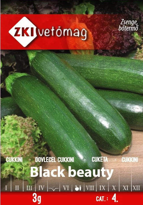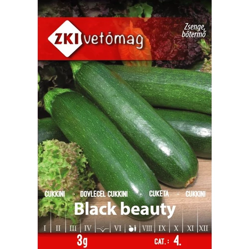 Cukkini - Black Beauty KLASSZIKUS, BŐTERMŐ - ZKI Házikerti termesztésre alkalmas cukkini fajta. Fő- és másodvetésre is ideális , biztosan termő, nagy terméshozamú fajta. Termése sötétzöld, barázdált, hengeres alakú. Friss fogyasztásra és savanyításra is tökéletes. Átlagosan 10-12 cm hosszúságban érdemes leszedni a termést. Érdemes nagy helyet hagyni egy-egy tőnek, mert bő termésének és levélzetének a szellőzés kimondottan jót tesz.