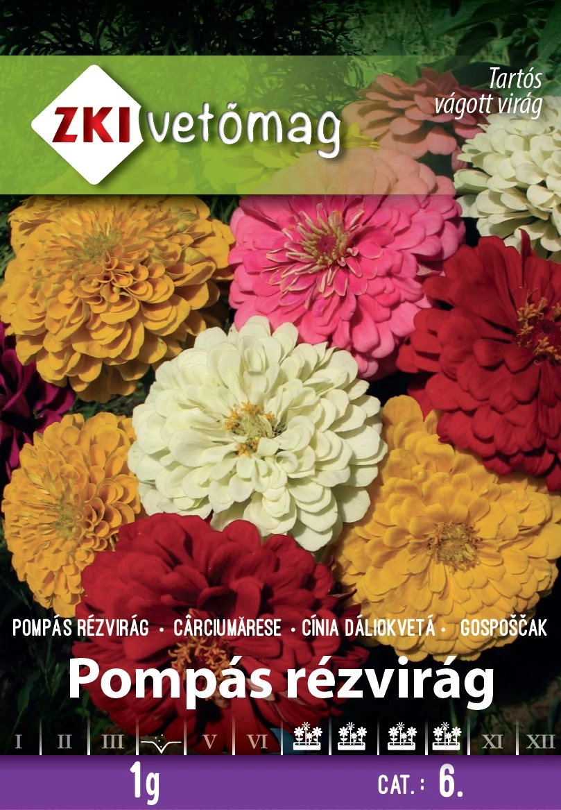 Dáliavirágú Pompás Rézvirág SZÍNKEVERÉK Zinnia elegans. A csomag 1g vetőmagot tartalmaz. Színfoltok képzésére, vegyes virágágyak díszítésére ajánlott, vágási célra kiváló egynyári virág. Tápdús, mérsékelten nedves talajt és napos, meleg fekvést igényel.