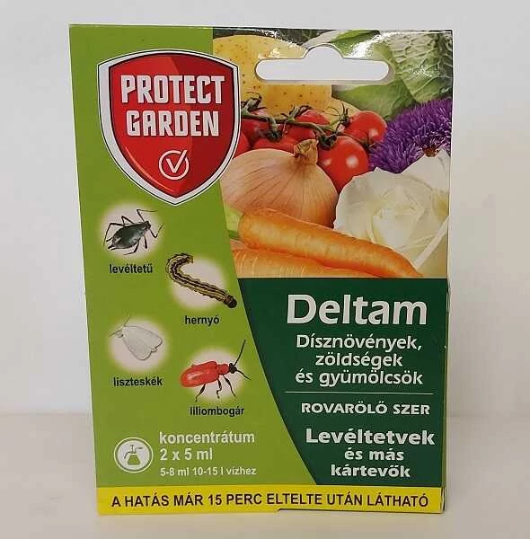 Deltam kontakt hatású rovarölő szer 2x5ml - CSAK KERTÉSZETÜNKBEN VEHETŐ ÁT Kontakt hatású rovarölő permetezőszer, a Decis rovarölő szerrel azonos hatóanyaggal. Dísznövények, zöldségek és gyümölcsök rovarok elleni védelmére (levéletetű, hernyő, lisztecskék, liliombogár stb.) Folyékony rovarölő permetező szer molykártevők, levéltetvek, cseresznyelégy, amerikai szőlőkabóca, hernyókártevők, tripszek, káposztalégy, lombrágó hernyók, csipkéspoloska, kukoricamoly ellen.