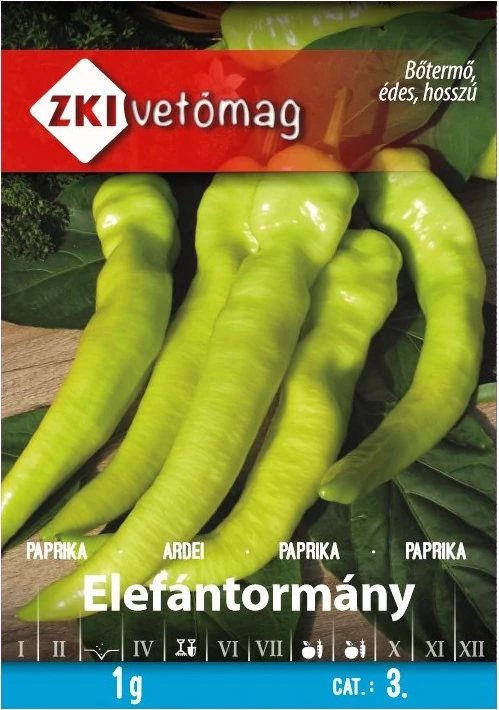 Elefántormány Étkezési Paprika ÉDES Nem csípős, folytonnövő, elsősorban hajtatásra javasolt fajta, de szabadföldön is minden probléma nélkül termeszthető. Különleges tipus, folytontermő bokrú, 50-60cm-es, bőtermő, fényhiányra nem érzékeny. Fejlődési sebessége kimondottan gyors, édes termése hosszú, hegyes, élénkzöld, 30-40g tömegű. Nagyon tetszetős, hosszú, alakja elefántormányhoz hasonló. A tasak 1g vetőmagot tartalmaz. Palántázás ideje: december-január-február, Érési ideje: április-május