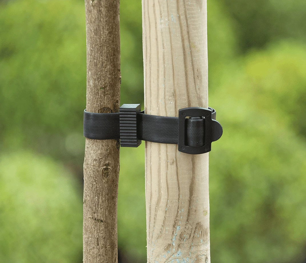 Facsemeték biztos, tartós rögzítésére. Könnyen kezelhető, biztonságos csatos megoldás. Széles műanyag anyagának köszönhetően nem vág bele a fa sérülékeny törzsébe. Rögzíthetjük egy karóhoz, vagy három karóhoz is kiköthetjük a facsemetét, hogy az erősebb széllökések egyik irányból se tudják meghajlítani az elkövetkezendő 1-2 évben, amíg szépen megerősödik. Többször is használható, UV- és esőálló, évekig tartós anyagú termék.
