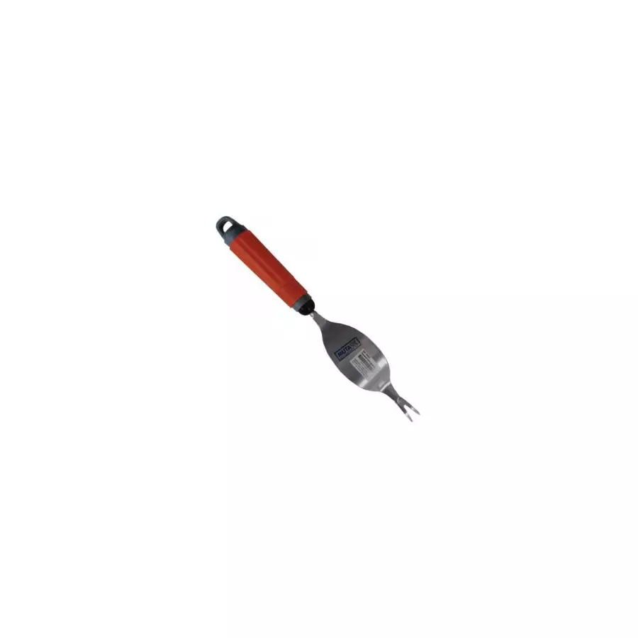 Fém gyomkiszúró Muta közel 35cm hosszú, kis kéziszerszám, ami könnyebbé teszi a gyomok kkihúzását. Fémből készült villásan végződő fej mellett a rajta található görbített erőkarral rövidebb időn belül biztosabb eredményt érhetünk el. Erősített, élénk színű műanyag nyelével kényelmes fogást biztosít. Hosszú élettartam érdekében javasoljuk a kerti szerszámok használat utáni tisztítását. Télre érdemes hótól, fagytól védett helyen tárolni.