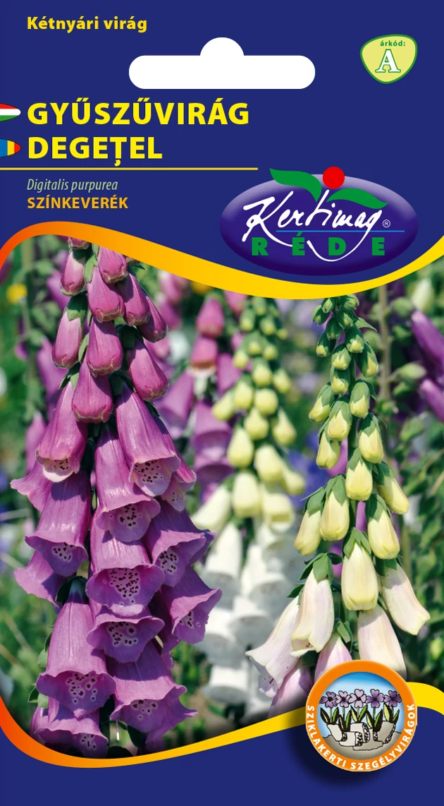 Gyűszűvirág - Színkeverék - Rédei Kertimag (Digitalis purpurea) Évelő gyűszűvirág, vegyes színkeverék. Vágott virágnak, és évelőágyásba ajánljuk.Tartós, hetekig gyönyörűen virágzó fajta. Jó minőségű, laza, tápdús talajba, félárnyékos fekvésbe ültesse! A túl meszes, kötött talajt nem kedveli. Mérgező növény. A növény virágja sötét-, világos rózsaszín, halvány sárga, vagy fehér színű, szép tölcsérekben sorakozva. Magassága kb. 100cm. Ajánlott sortávolság: 40cm. Ajánlott tőtávolság: 20cm.