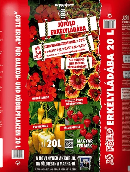 Jó Föld Balkon virágföldkeverék 20L Jó minőségű virágföldkeverék balkonnövények számára XXL mennyiségű virágzást elősegítő táppal 20 literes kiszerelésben. Piros zsákos, extra minőségű JÓ FÖLDKEVERÉK balkonnövények és egyéb virágzó növények számára XXL mennyiségű, virágzást elősegítő Osmocote tápgolyócskákkal, 4-5 hónapos hatástartammal.