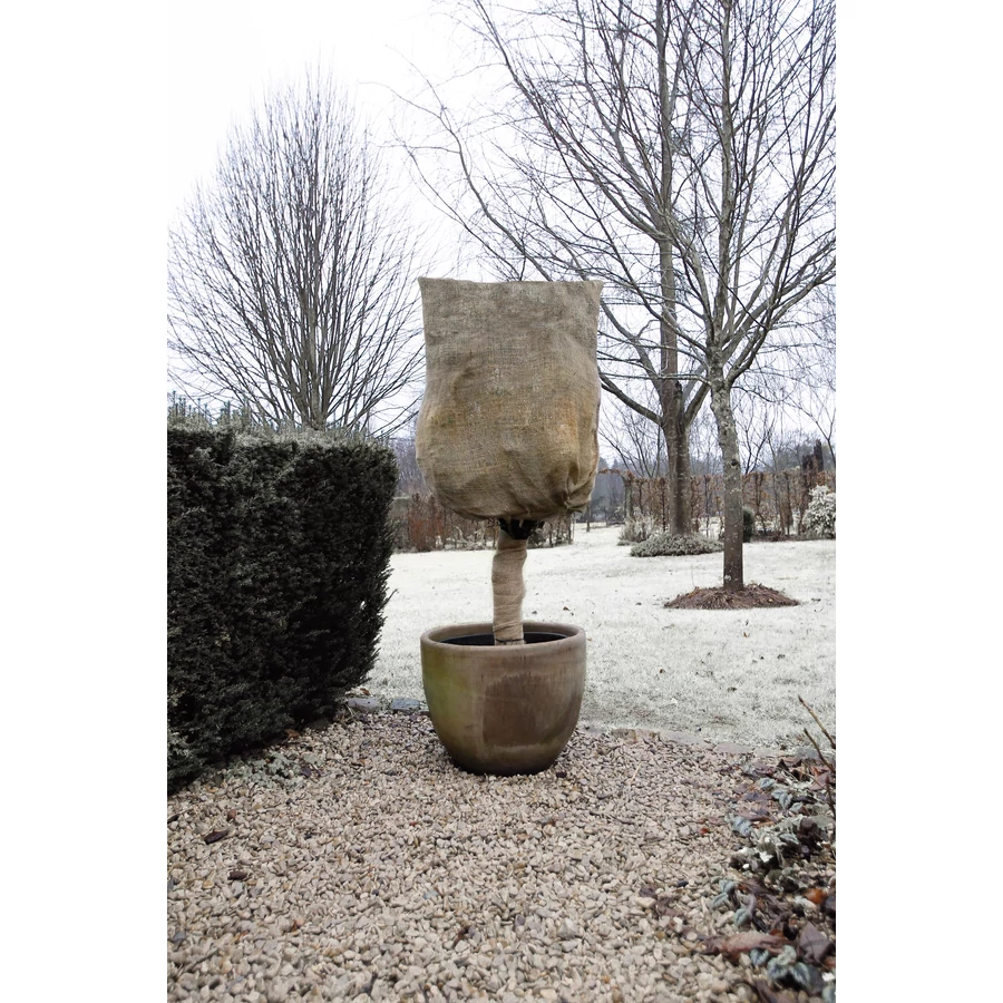 Téli takaró fólia zsinórral! Mérete: 1m x 75cm - Sűrűsége: 230 gr/m2 - Szín: természetes barnás. UV -és fagyálló. Védjük téliesítő fóliával fagyérzékeny növényeinket. A nálunk kapható jutából készült szövetzsákot azért érdemes használni, mert véd a fagyoktól, ezáltal meggátolva a növények kipusztulását. Lég- és vízáteresztő, vagyis az ezzel betakart növények nem fognak kiszáradni. Emellett még a fényt is megszűri, azaz üvegházként viselkedik - kiváló téli védelem. A szövettel nem csak a növényeket, de a növényeken fakadó rügyeket is meg lehet védeni a faggyal szemben. Szélsőséges időjárásban is erősen ellenálló, mint például a jégeső. Javasolt a szövettakarót időről-időre ellenőrizni, és ezzel egy időben egy kicsit szellőztetni is a növény rothadásának megakadályozása érdekében.