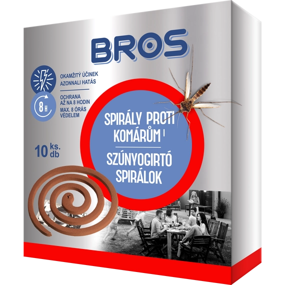 A BROS szúnyogirtó spirál 10db Rovarirtó és riasztó hatású szert tartalmaz, ami meggyújtást követően rögtön hat. Egy spirál akár 8 órán át tartó védelmet biztosít a szúnyogok és fekete legyek ellen. Kültéri helyekre (teraszokra, kertekbe) ajánljuk. A spirálokat használat előtt óvatosan szétválasztjuk, majd egyet a fémállvány felhajtott felére helyezünk és meggyújtjuk. Ezután elfújjuk a lángot és hagyjuk izzani a spirál végét, ami a kibocsátott gőzökkel űzi, távolítja el a rovarokat környezetünkből