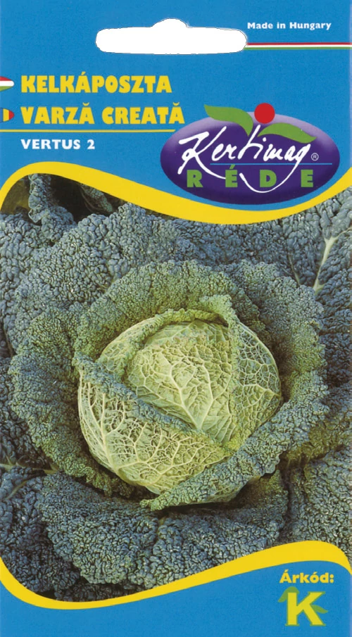 Kelkáposzta Vertus 2 - KÉSŐI HIDEGTŰRŐ Késői, hosszú tenyészidejű, másodvetésre is alkalmas, jól tárolható fajta. Szabadföldi és fólia alatti termesztésre is alkalmas. A fej 1,3-1,6 kg súlyú, nagy méretű. Nagy termőképességű, levélzete világoszöld, finoman hólyagzott, a fejek gömb alakúak, közepesen kemények. A tasak kb, 500-520 szem vetőmagot tartalmaz. Javasolt sortávolság: 60 cm, javasolt tőtávolság: 40 cm.