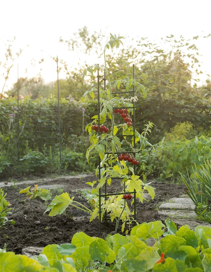 Kiszerelés: 3 darab 150 cm magasságú, 12 keresztrúddal összekapcsolt növénykaróból áll. Stabil háromszög alakú formája különösen alkalmassá teszi konyhakertekben vagy olyan cserepekben való használatra, amelyeknél a talajmélység nem teszi lehetővé a hagyományos növénykarók használatát.