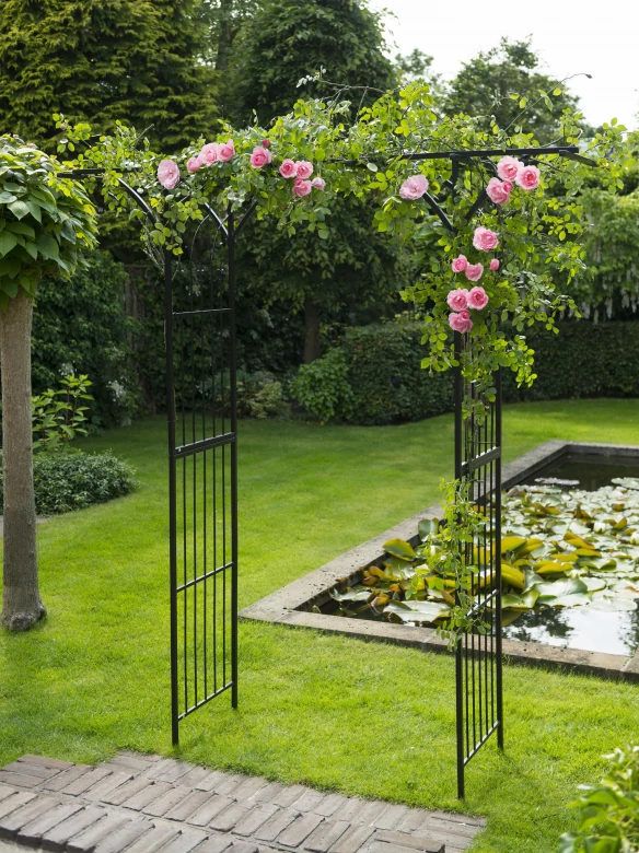 232*114*66cm Dekoratív fém rózsafuttató kapu. Gyönyörűen felfuttatható rá rózsa, vagy bármilyen magasra kúszó növény. Telepítése egyszerű, csak le kell szúrni a talajba.