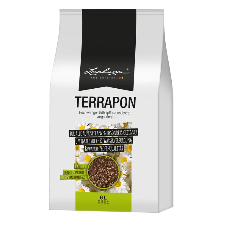 A Lechuza Terrapon ültetőközeg tápanyaggal 6 liter egy humusszal ellátott ásványi ültetőközeg szobanövények, balkonnövények és cserepes növények számára. Összetétele: humusz, horzsakő, zeolit és láva. A növényeket 6-12 hónapon át látja el tápanyaggal. A lassú feltáródású műtrágyának köszönhetően a növényt nem égeti, és egyenletesen látja el a szükséges tápanyagokkal.