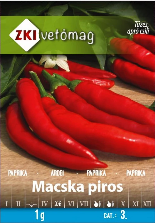 Macska Piros Paprika CSÍPŐS Folytonnövő, szabadföldi termesztésre ajánlott fajta. Friss fogyasztásra és szárításra is jó szívvel ajnljuk. Apró, hegyes, csüngő termése 9-10g tömegű, középzöldből pirora érő. Felfűzésre, ételízesítésre alkalmas fajta. Folytonos növekedésű fajta, szabadföldi termesztésre is alkalmas. Egy tasak 1g vetőmagot tartalmaz, tasakonként 110-130 szem vetőmag kerül a csomagolásba.