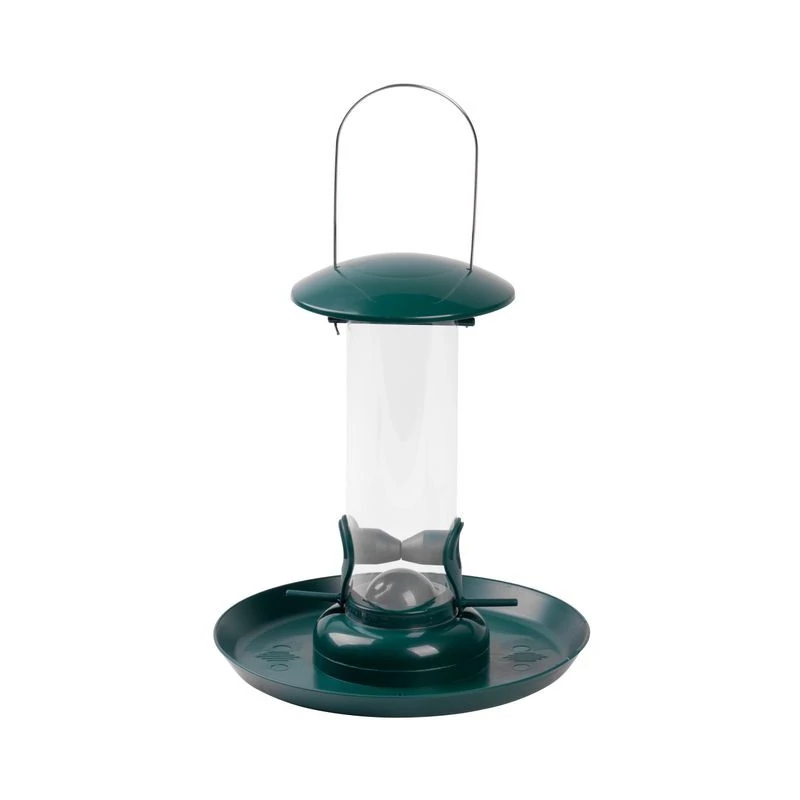 Zöld kényelem a kert kis vendégeinek. Tedd otthonossá kertedet vagy erkélyedet ezzel a dekoratív, önetetős madáretetővel, amely egyszerre praktikus és esztétikus kiegészítője a téli madárgondozásnak! A strapabíró műanyagból készült, felakasztható etető akár 370 ml madáreleséget is képes tárolni, így hosszú időn át biztosítja a madarak számára a friss táplálékot még hideg, fagyos időben is. Átlátszó tartálya révén mindig könnyen ellenőrizhető, mennyi eleség maradt, a zárt rendszer pedig megóvja az eledelt az esőtől és a hótól. Az önetetős mechanizmus automatikusan adagolja az eleséget, így a madarak mindig találnak mit csipegetni, miközben Te kevesebb utántöltéssel gondoskodhatsz róluk. Felakasztod. Feltöltöd. Élettel telik a kert.