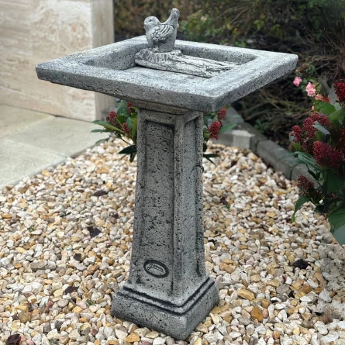 Robosztus megjelenésű, erős, fehér cement alapanyagú műkőből készült madárfürdető, mely egy speciális színezési eljárást követően nyerte el végső megjelenését. Kialakítása kültéri használatra felkészített, tehát minden típusú környezeti hatásnak (hőség, fagy, csapadék, UV) ellenáll. Méretei: magasság:68cm, szélesség: 39cm, súlya: 42kg.