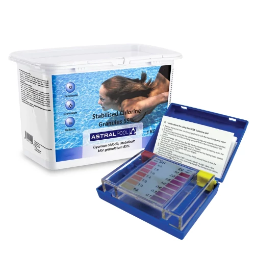 A csomag tartalma: 1kg Superklór granulátum ASTRALPOOL + 1 doboz Klór és pH mérő tablettás teszter "C". ajándék indikátor tablettával! Együtt még olcsóbb!