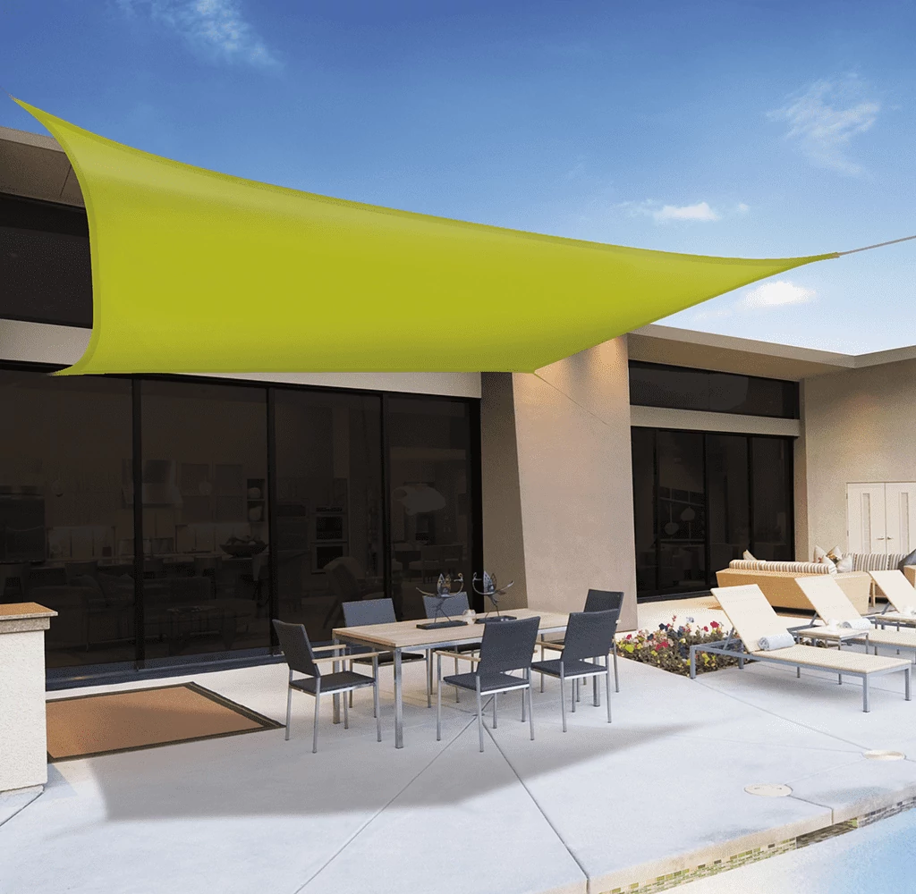 Látványos és jópofa megoldás több háromszög alakú napvitorla kihelyezése. Ha egy kissé takarják egymást, az árnyékolás folyamatosan megoldott, bármerre is jár az égen a nap. Ha azonban a teraszt teljesen be szeretnénk fedni, inkább négyszögletű napvitorlát válasszunk! A leggyakoribb a 3,6 és az 5 méteres oldalhosszúságú napvitorla, ezekkel, vagy kombinációjukkal valójában minden megoldható. Többféle színben és méretben kapható, ezért minden stílusú és méretű kertbe megtalálhatjuk az oda leginkább illő napvitorlát. Szürke, natúr (sárga), narancs, fehér és zöld színekben a leggyakoribb. A szürke általában kevésbé vízáteresztő.