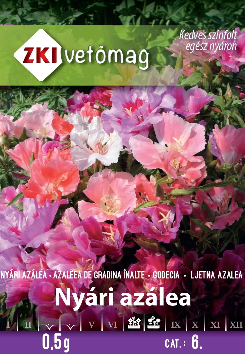 Nyári azálea színkeverék MAGAS Godetia grandiflora. Színpompás, dekoratív virágai miatt házikertek kedvelt növénye. Vegyes virágágyak díszítésére ajánljuk. A csomag 0,5g vetőmagot tartalmaz.