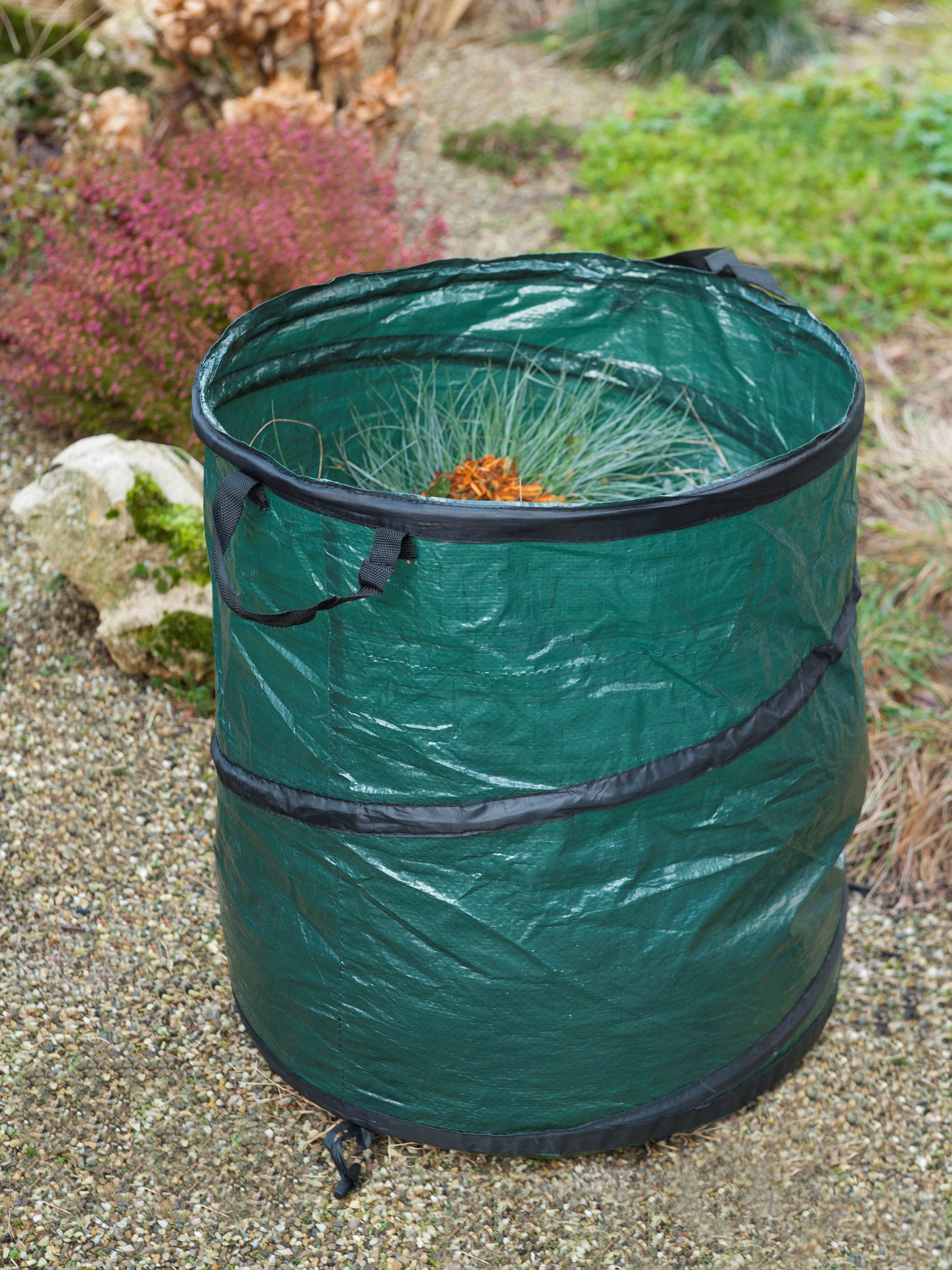 Lombgyűjtő zsák 90L 50x75cm ÖSSZECSUKHATÓ Lomb- és kerti hulladékgyűjtői zsák polietilén anyagból, beépített pirál merevítővel. Nagyon praktikus "felugró" típus, így kerti munka közben nem kell bajlódni azzal, hogy tartsuk a zsák száját, miközben megpakoljuk. Könnyen összecsukható, a könnyebb tárolás érdekében rögzíthető kis füllel, nehogy kinyíljon. Zöld színben, 2 füllel.. Levelek, nyesedék, egyéb zöldhulladék gyűjtésére. Könnyű súlyánál fogva egyszerűen szállítható benne mindenféle kerti hulladék.