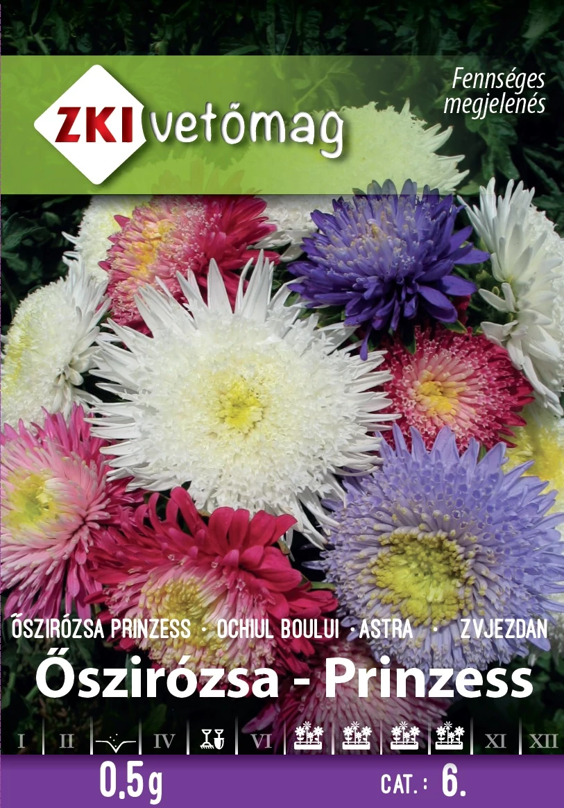Őszirózsa Prinzess színkeverék Callistephus chinensis. A csomag 0,5g vetőmagot tartalmaz. Vegyes virágágyak díszítésére ajánlott, egynyári növény. Jó vízáteresztőségű, tápanyagban gazdag talajt, napsütötte fekvést igényel. Olyan helyre ültessük, ahol előző évben nem volt őszirózsa.
