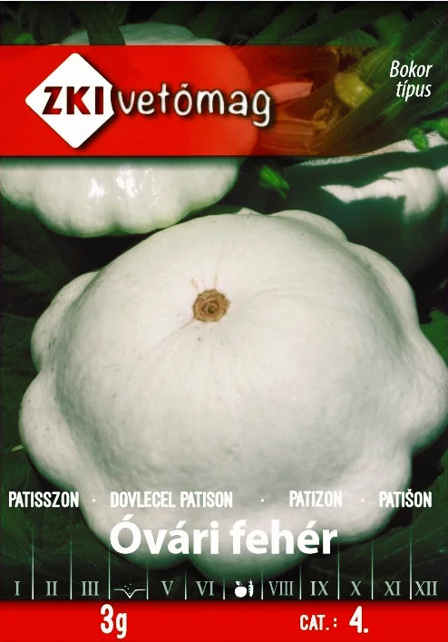 Patisszon - Óvári fehér - ZKI Termései a szedési időponttól függően 0,15-1,5 kg tömegűek. Héja fehér, tenyészideje 90-100 nap. Tápanyagigényes növény, a fészektrágyázást meghálálja. Friss fogyasztásra és savanyításra is felhasználható.(A tasak kb. 30-40 szem vetőmagot tartalmaz.)