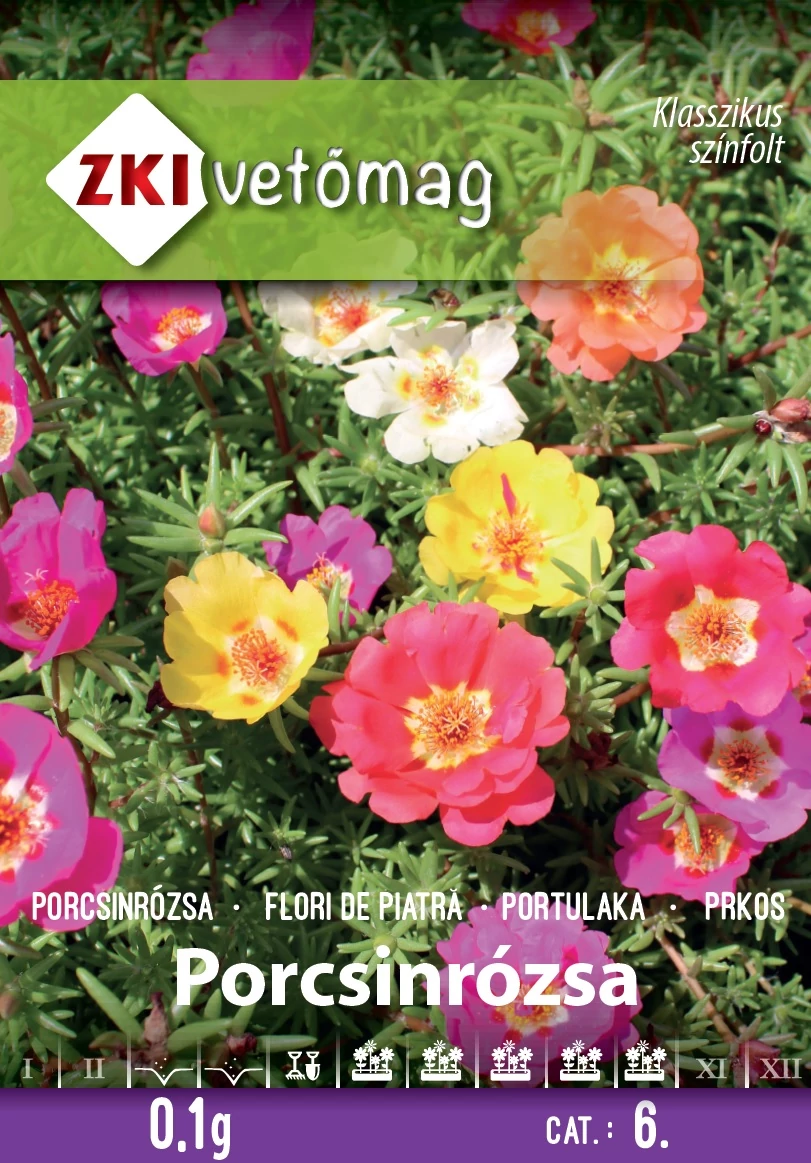 Porcsinrózsa alacsony színkeverék Portulaca grandiflora. A csomag 0,1g vetőmagot tartalmaz. Színpompás, egynyári növény. Meleg fekvésű kőkertek, kőfalak, vegyes virágágyak és erkélyládák díszítésére ajánljuk. Kedveli a meleg, laza szerkezetű talajt.