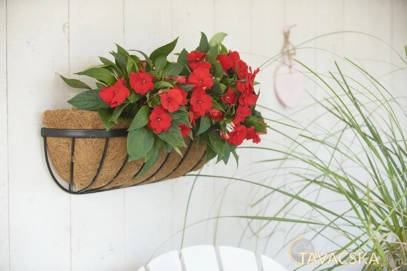 Kókuszbetétes fali balkonláda fém vázzal. A váz anyaga: fekete műanyaggal bevont kovácsoltvas. Rusztikus hatású kivitel. Gyönyörű dekoráció teraszokra, balkonra egy szép növénybeültetéssel. A betét cserélhető, jól szellőzik benne a növény gyökere. A természetes anyag egészséges, dús virágzást és növekedést biztosít a növény számára. Kókuszbetét nélkül szállítjuk. Átmérő: 61cm, Magasság: 16,5cm