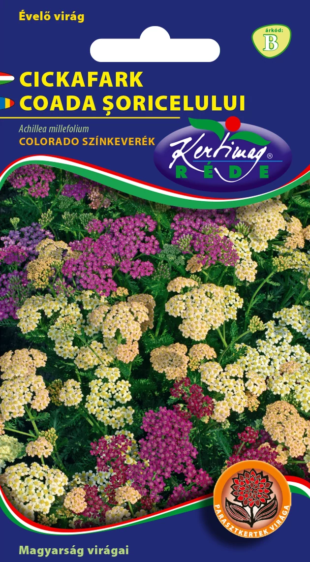 Cickafark - Színkeverék - Rédei Kertimag - Évelő cickafark - Achillea millefolium 0,25g Az alapfaj hazája Kaukázus és Kis-Ázsia. A virág magassága 100 cm. A sárga fészkek sátorozó, lapos virágzatban állnak.Teljes virágzásban vágva száraz virágnak ajánljuk. Napfényes helyre, jó vízáteresztő talajba ültessük.