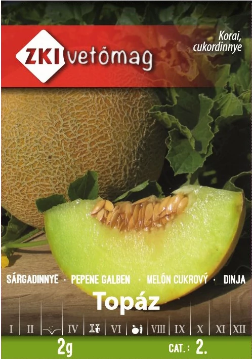 Sárgadinnye Topáz - KORAI - ZKI Korai érésű, turkesztán típusú dinnye. A növény közepes indanövekedésű és lombú. Termése gömbölyű, felszíne erősen cseres. Héja éretlenül zöld, sárgára érik. Átlagos tömege 1,2-1,5 kg, húsa zöldesfehér színű, vastag, édes, lédús. Magürege kicsi. A tasak 30-35 szem vetőmagot tartalmaz.