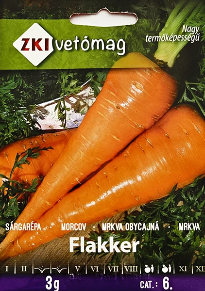 Sárgarépa Flakker ÓRIÁS 3g - ZKI Nagy, erőteljes lombozatú, hosszú tenyészidejű fajta (180-200 nap). Nagy termőképességű, gyökere hosszú, nagytestű. Kiváló íze mellett magas B1-, B2-, B6- és C vitamin tartalma, valamint kimondottan jó tárolhatósága miatt nagyon közkedvelt fajta. Magas karotin-, cukor- és szárazanyagtartalma miatt a feldolgozóiparban is közkedvelt fajta. Síkművelésre és bakháton való termesztésre is javasoljuk.