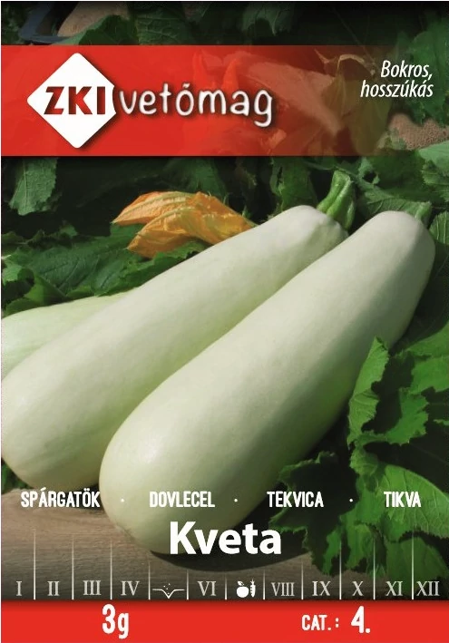 Spárgatök - Kveta - JÚNIUSI ÉRÉSŰ - ZKI Friss piaci, szabadföldi termesztésre, javasoljuk. A termések hengeresek, fehérek, átlagos súlyuk 1,5 kg. A csomag 3g vetőmagot tartalmaz. Június-júliusi érésű, szabadföldi, bokor növekedésű fajta. Friss fogyasztásra és és hűtőipari felhasználásra is alkalmas. Ajánlott sortávolság: 100cm Ajánlott tőtávolság: 100cm. A tasak kb. 15-20 szem vetőmagot tartalmaz.