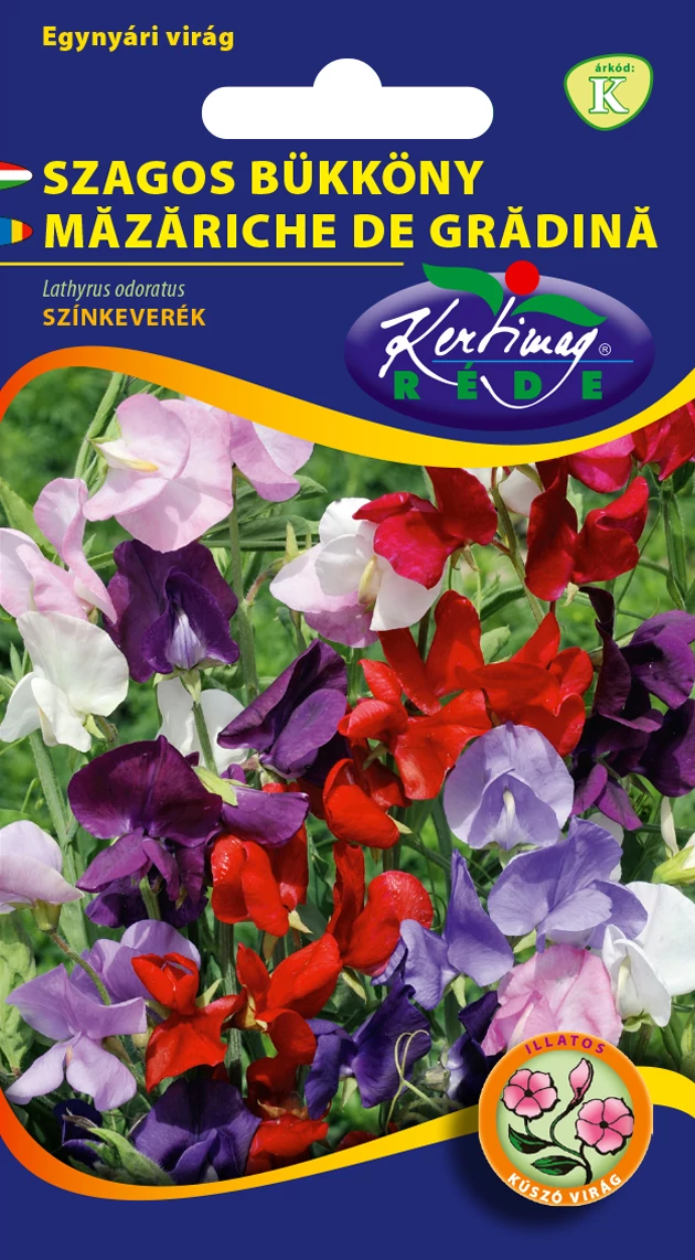 Szagos bükköny - Színkeverék - Rédei Kertimag Nem csávázott vetőmag. Szagos bükköny (Lathyrus odoratus) egynyári virágzó. Víz- és tápanyagigényes növény, támfalra, kerítésre futtassuk! Virágágyások kedvelt nyári virágja.