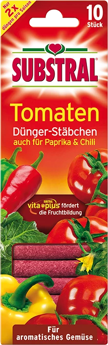 Substral Piros Táprúd paradicsomhoz és zöldségekhez 10db Kényelmesen alkalmazható, kész tápanyag paradicsom, paprika és egyéb zöldségfélék számára. Több és ízletesebb termés könnyedén. Paprikához és Peppronihoz is javasoljuk! Kész tápanyagrúd paradicsom és egyéb zöldségfélék számára. Könnyedén kezelhető forma az egyszerű növényápolásárt. Kényelmessé teszi a növényápolást. Termésfokozást elősegítő táppal, biztosítja a kiegyensúlyozott tápanyag-ellátást zöldségnövények számára. Substral Vital Aktív formulával, hozzáadott vassal, plusz káliummal