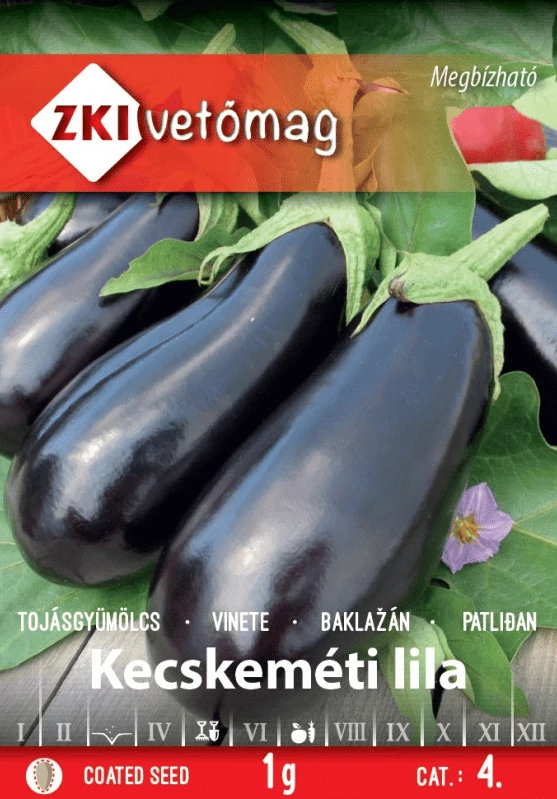 Tojásgyümölcs - Kecskeméti lila - ZKI A padlizsán meleg-, fény-, tápanyag-, és vízigényes zöldség. Humuszban gazdag, szélvédett és napsütötte helyet igényel. A növény sűrű, zárt, alacsony bokrot képez. Fólia alatti termesztésre javasolt, és szabadföldön is eredményesen termeszthető fajta. Az első termések a vetéstől számítva 130–145 napra szedhetők. Termése félhosszú, ovális, 250 g feletti. Húsa halvány krémszínű. Friss fogyasztásra és konzervipari célra alkalmas. A tasak kb. 230–250 szem vetőmagot tartalmaz.