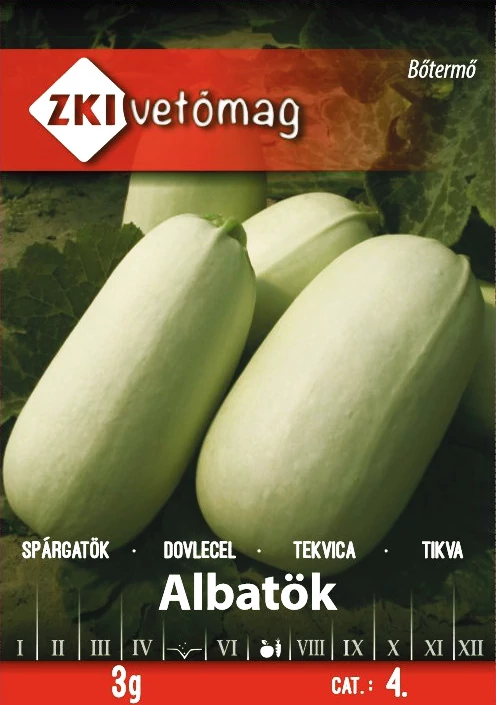 Spárgatök Albatök - KORAI - ZKI Termése szabályos henger alakú, enyhén bordázott. Tömege: 4-5 kg. Húsa zöldesfehér, vastag, héja vajszínű, éretten sárga. A szárazságot jól tűri. Friss fogyasztásra és hűtőipari feldolgozásra egyaránt alkalmas. A tasak kb. 20-25 szem vetőmagot tartalmaz.
