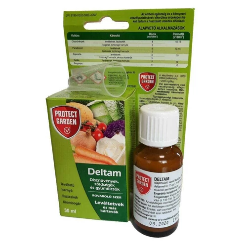 Deltam kontakt hatású rovarölő szer 30ml - CSAK KERTÉSZETÜNKBEN VEHETŐ ÁT Kontakt hatású rovarölő permetezőszer, a Decis rovarölő szerrel azonos hatóanyaggal. Dísznövények, zöldségek és gyümölcsök rovarok elleni védelmére (levéletetű, hernyő, lisztecskék, liliombogár stb.) Folyékony rovarölő permetező szer molykártevők, levéltetvek, cseresznyelégy, amerikai szőlőkabóca, hernyókártevők, tripszek, káposztalégy, lombrágó hernyók, csipkéspoloska, kukoricamoly ellen. Adagolása: 5-8ml ml szer 10-15 l vízhez. Hatás már 15 perc elteltével látható!
