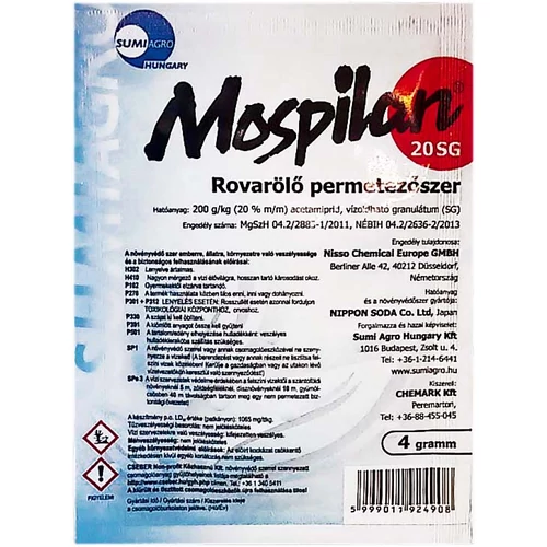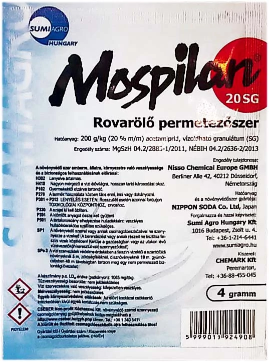 Mospilan 20SG - CSAK KERTÉSZETÜNKBEN VEHETŐ ÁT - Felszívódó hatású rovarölő szer. Szabadforgalmi (III.) kategóriájú növényvédő szer, csak személyesen vehető át gazdaboltunkban. Futárszolgálattal nem szállíttatható!