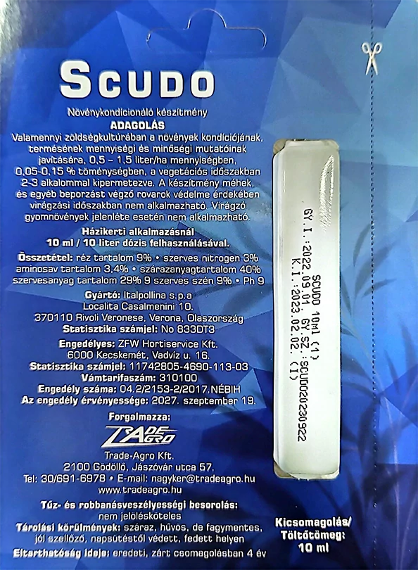 Scudo növénykondícionáló készítmény 10ml ampullás Aminosav- és glükonsavbázisú lombtrágya rézzel, melyet 100% növényi enzimatikus hidrolízissel (sörgyártási technológia) állítanak elő. A szerves nitrogén és aminosavval együtt kijuttatott rézkombináció hatására a növény természetes ellenálló képessége jelentősen növekszik. Kipermetezéskor az aminosav azonnal felszívódik a lombon keresztül és segíti a réz hatóanyag bejutását a növény szállító szöveteibe. Ezáltal a réz nem a lombfelszínen, hanem a SZÖVETEKBEN fejti ki hatását, aminek köszönhetően a GOMBÁS- és BAKTÉRIUMOS betegségek nem képesek a növényen megtelepedni. Használatával a növény ellenállóvá válik a gombás és baktériumos betegségekkel szemben. Két hét alatt a réz lebomlik a növényben és a védettség megszűnik. NEM növényvédő szer!