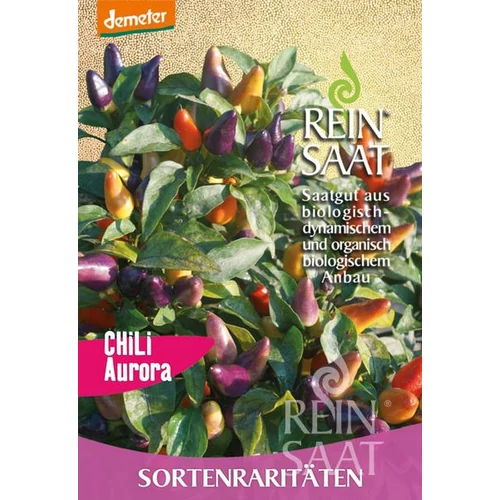 Az Aurora chili paprika bio vetőmag a ReinSaat új fajtája. Annyira szép, hogy dísznövényként is megállja a helyét a kertben vagy akár cserépben, a teraszon. Kicsi, tömör bokron neveli előbb lila virágait, majd számos termését, amelyek látványosan, lilából sárgán keresztül pirosra érnek. Az Aurora chili paprika termések a 10-es csípősségi skálán 5-6-os fokozatot érnek el. Kiválóan alkalmas konténeres és balkon termesztésre!