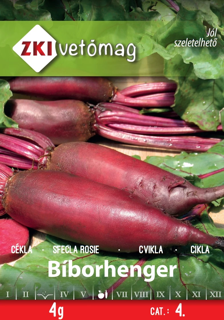 Cékla Bíborhenger - KORAI VAGY MÁSODVETÉSRE - ZKI Nagy termőképességű, a hazai viszonyokhoz jól alkalmazkodott fajta. Húsa sötétvörös színű, a gyűrűk alig látszanak. Jól szeletelhető, ipari feldolgozásra is javasoljuk. Rövid tenyészidejű, vetéstől a betakarításig 90-110 nap telik el. Magas tápanyag- és vízigényű. Kiemelkedően magas antioxidáns tartalma amiatt az egészséges étkezés nélkülözhetetlen zöldségféléje. Fűtetlen fólia alatti hajtatásra, és korai szabadföldi termesztésre. Ajánlott sortávolság: 35cm Ajánlott sortávolság: 15cm Vetésmélység: 2-3cm