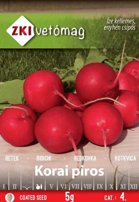 Retek - Korai piros - ZKI Tenyészideje rövid, 30-35 nap. Fűtetlen fólia alatti hajtatásra, és korai szabadföldi termesztésre is alkalmas fajta. Gumója gömbölyű, skarlátpiros. Lombja kicsi. Húsa hófehér, héja vékony, pudvásodásra kevésbé hajlamos. Íze kellemes, enyhén csípős. Friss fogyasztásra javasoljuk.