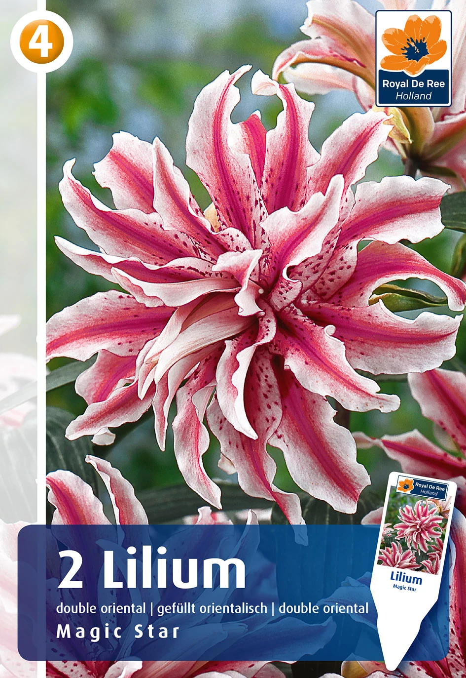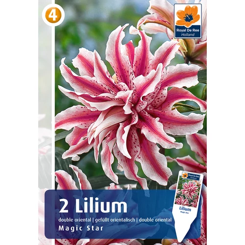 Magic Star dupla szirmú liliom virághagyma - De Ree - A luxus és elegancia megtestesítője. A dupla szirmok miatt minden egyes liliom olyan, mintha egy virágzó mestermű lenne. Az orientális liliomokhoz hasonló, bódítóan édes illatuk estére még intenzívebbé válik. A teltvirágú, dupla szirmú liliomok pollenmentesek, nem hagynak foltot, nem okoznak allergiát, így tökéletes választás, ha beltéri vágott virágként is szereznéd használni. Napos vagy félárnyékos helyen, tápanyagban gazdag, jó vízelvezetésű talajban gyönyörűen fejlődnek, nem igényelnek túl sok gondozást. Ültesd őket csoportosan, hogy mesés, dús virágtengerben gyönyörködhess! Ne hagyd ki ezt az exkluzív szépséget! Rendeld meg most, és varázsolj luxust kertedbe vagy otthonodba! Ez a liliomfajta különleges, dupla szirmaival pompás dísze a kertnek, alkalmi díszcserjék közötti virágos foltok kialakítására vagy vágott virágnak. Télálló, így évekig kint hagyhatod a kertben. Vásárlás után hamar ültesd el, ne hagyd kiszáradni a gumót!