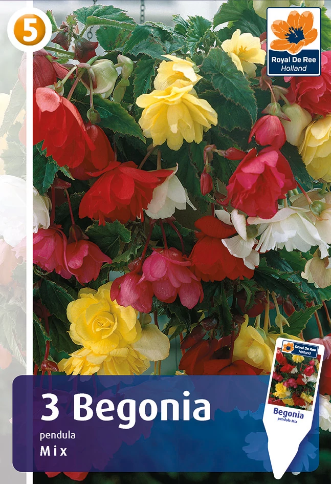 Csüngő virágú Begónia Pendula MIX gumó - De Ree - Csüngő virágú begónia színkeverék. Alacsony termetű, 20cm magasra növő, nagyon mutatós, nem túl igényes, virágait 30cm hosszú, csüngő hajtásokon hozza. A csüngő virágú Pendula MIX begónia egyedülálló, dús, leomló virágzuhatagával és élénk, vibráló színeivel minden kertberát szívét rabul ejti. Könnyű gondozhatóságának köszönhetően nagy kedvenc a teraszok, erkélyek, balkonok virágtartóiban, függőkosaraiban. Bársonyos szirmai és telt, elegáns formája minden tekintetet magára vonz. Jól érzi magát félárnyékban vagy árnyékban is. Rendszeres, de kíméletes öntözést igényel, a virágzó tápot meghálálja. Májustól akér a fagyokig folyamatosan ontja csodás virágait. Az elnyílt virágok eltávolítása elősegíti a még gazdagabb virágzást. Tökéletes választás, ha romantikus, elegáns és szemet gyönyörködtető virágkompozíciót szeretnél otthon! Rendeld meg most, és varázsolj színpompás virágtengert a kertedbe vagy az erkélyre! A fagyveszély elmúltával ültethető a kert napos helyére. Sekély ültetést kíván - a gumó közvetlenül a talajfelszín alatt legyen! Talaja soha ne száradjon ki teljesen! cserépbe, balkonádába is ültethető, de a tűző napot vagy erős szelet nem kedveli. Korábbi virágzáshoz a szobában cserépbe vagy ládába ültetve előhajtatható. Kiültetni csak a fagyveszély elmúltával, május közepétől szabad, télen tárold fagymentes helyen!