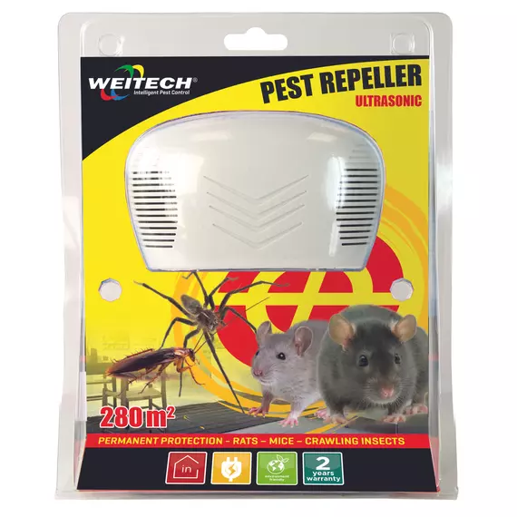 Weitech Ultrahangos kártevő riasztó 280 m2 elsősorban egér, bolha, kullancs, pók, csúszó-mászó elriasztására, illetve távol tartására szolgál. A kártevő riasztó üzembe helyezése nagyon egyszerű, bárki által elvégezhető. Egyszerűen helyezze a készüléket bármely konnektorba, ezt követően a riasztó hátulján található kapcsolóval be lehet állítani, hogy elsősorban rágcsálót, vagy rovarokat szeretnénk távol tartani, az fertőzöttség mértékétől függően erős, vagy gyengébb hangokat bocsásson ki, magasabb, vagy alacsonyabb feszültség fogyasztással. Az eszközt padlások, pincék, vagy használaton kívüli helységek karbantartására ajánljuk, de alkalmas szobába is, alacsony hang és áramfogyasztású fokozaton. A készülék nem igényel karbantartást, folyamatosan üzemeltethető amennyiben így kívánja. Ha szükséges, alkalmanként helyezze át másik konnektorba a hatékonyabb működés érdekében. A készülék 280 m2-es területen nyújt hatékony védelmet. Nagyobb terület esetén használjon több készüléket, vagy nagyobb területre alkalmas kártevő riasztót. Érdemes olyan konnektort használni, amely előtt nincs akadály az ultrahang terjedésének. Az ultrahang a kemény felületekről visszaverődik, és így maximálisan kifejtheti hatását, míg a puha felületek pl. függöny, szőnyeg az ultrahangot elnyelik.