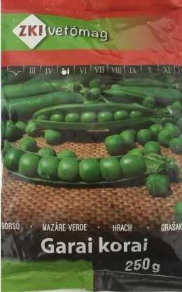 ZÖLDBORSÓ Garai Korai - ÁTTELELŐ 200g Finom ízű, nagy szemű, áttelelő, nagyon korai érésű zöldborsó fajta, 4-5 nappal korábban érik, mint a Rajnai törpe. A növény magassága 50-60 cm. Vetőmagszükséglet: 80-120 g/10 m2. Piacos terméseit friss fogyasztásra és feldolgozásra is ajánljuk. Tápanyagban dús, laza talajon termesszük! Frisspiaci célra és fagyasztásra is használható. Sortávolság: 15cm, Tőtávolság: 5cm